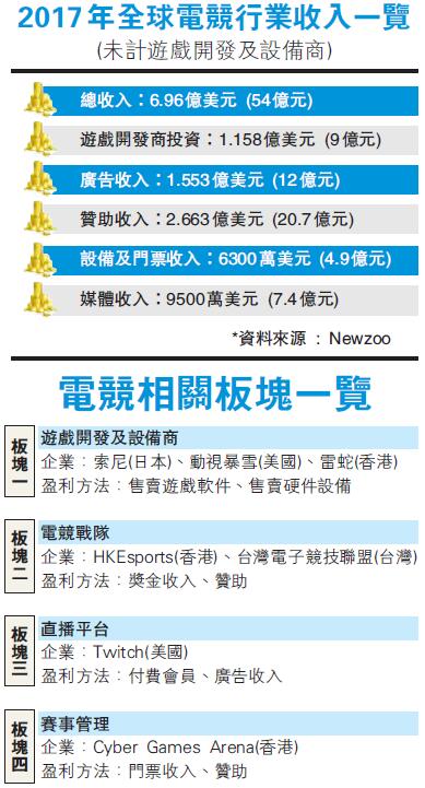 會計師事務所羅兵咸永道8月初發表電競市場報告稱,香港不單有潛力在電競產業分一杯羹,更有潛質成為亞洲電競中心。雖然全球去年電競行業收益只有24億元,但據電競權威研究公司Newzoo的《電競市場年報2017》顯示,今年電競行業收益同比勁增1.25倍,達到54億元,收入來源包括遊戲開發商投資、廣告、贊助、設備及門票、媒體,其中以贊助收入佔比最多,達到20.7億元。
