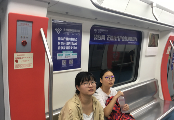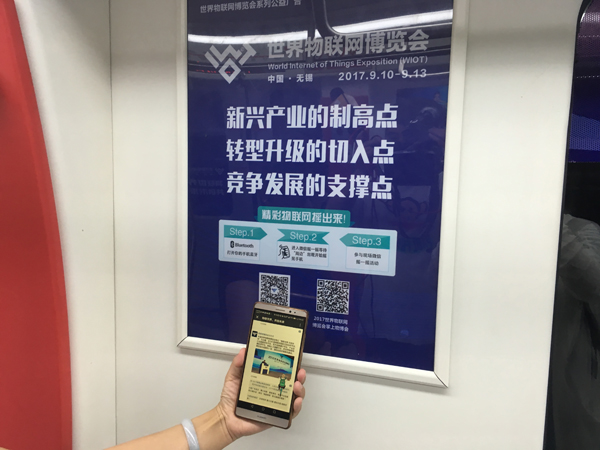 无锡地铁广告传媒公司王洪琼介绍,专列采用品牌专列形式;列车内车眉,车窗,车门贴类+看板,有照片图示。乘客开启手机微信摇一摇功能可以参与物博会互动,摇出物联网精彩H5活动页面,可以线下场景引发线上转发。
