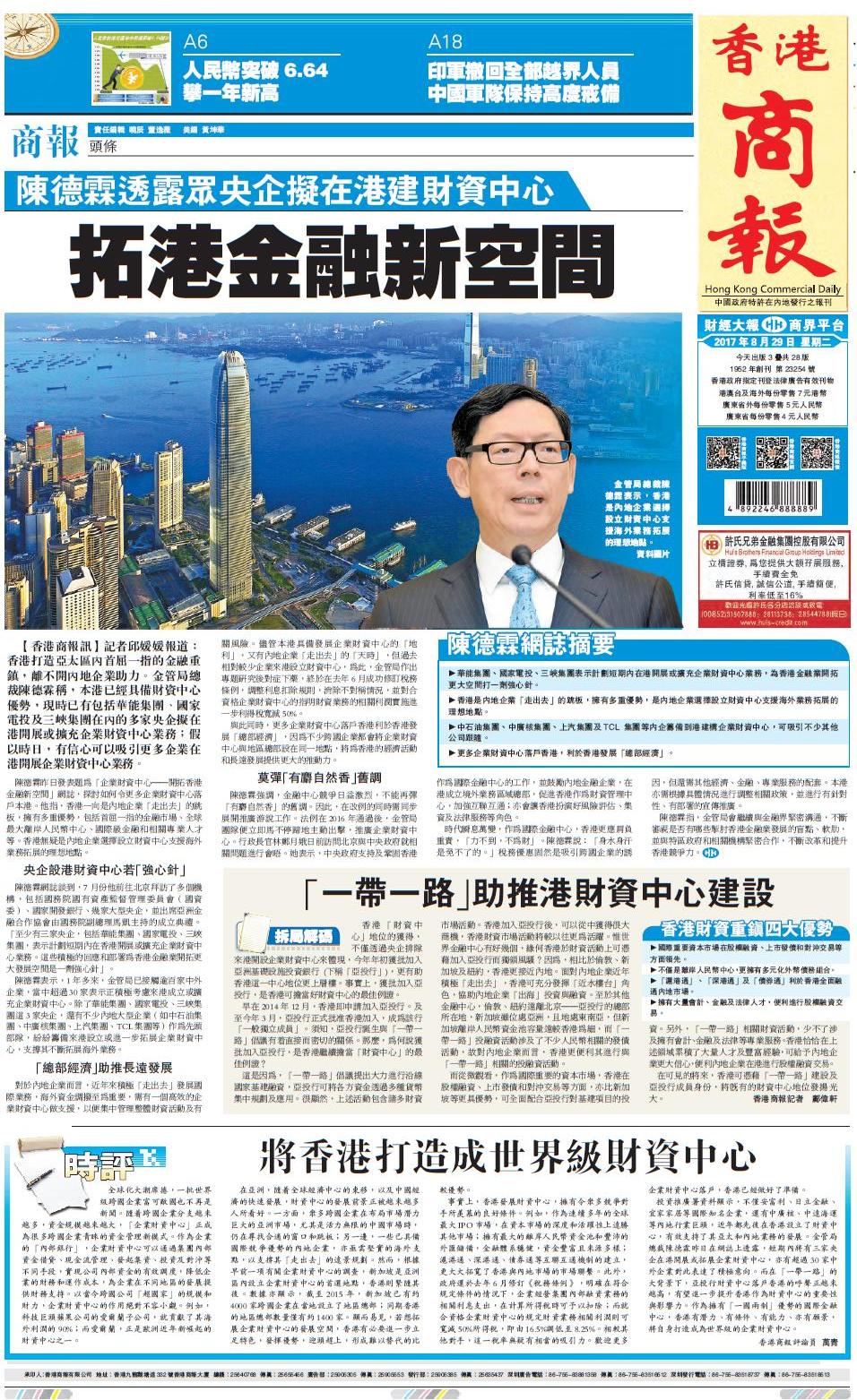 陳德霖網誌談到,7月份他前往北京拜訪了多個機構,包括國務院國有資產監督管理委員會(國資委)、國家開發銀行、幾家大型央企,并出席亞洲金融合作協會由國務院副總理馬凱主持的成立典禮。「至少有三家央企,包括華能集團、國家電投、三峽集團,表示計劃短期內在香港開展或擴充企業財資中心業務。這些積極的回應和部署為香港金融業開拓更大發展空間是一劑強心針」。