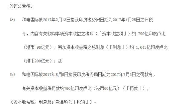 今年8月,和電國際又收到印度稅務當局的罰款令,有關資本收益稅罰款約790億印度盧比(港幣96億元)上述股權有關資本收益稅罰款約790億印度盧比(約96億港元)。