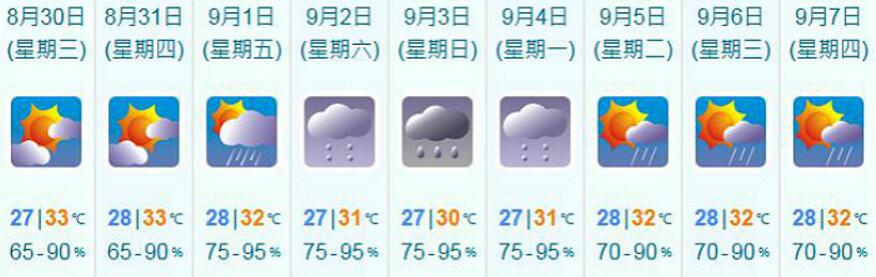 未來數天天晴酷熱,但周五開始有驟雨,周六周日有雷暴,氣溫亦稍跌至27度至30度左右。