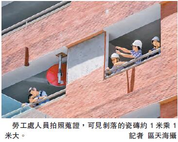 【香港商報网訊】記者區天海報道:長沙灣道一幢30年樓齡商廈,發生外牆瓷磚剝落擊斃工人意外,一名年屆花甲鋁板裝嵌工人,昨晨在正興建中大廈后巷運送鋁板時,毗鄰大廈5樓外牆一幅面積約1米乘1米的瓷磚突然松脫剝落飛墮后巷,擊中工人重傷昏迷,送院搶救不治,警方調查后拘捕一名大廈管理負責人。