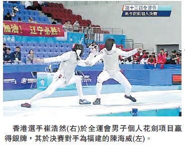 【香港商報网訊】記者萬家成報道:港隊在天津舉行的第13屆全國運動會中,再增添一面銀牌。被稱為「花劍美男」的香港選手崔浩然,昨於男子個人花劍項目中僅負於福建選手陳海威,與金牌擦身而過,本港在今屆全運會暫時贏得兩銀一銅。