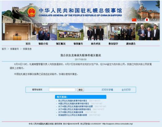 中國駐札幌總領館30日發布消息称,札幌南警察署負責人向我館通報稱,8月27日在釧路市發現的女性尸體,經DNA鑒定為我失聯公民。我館已向我失聯公民家屬通報上述情況。