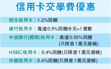 除了電腦外,學費也是不少同學家長關注的地方,畢竟一個學期兩萬元左右的費用也不少,開學前善用信用卡優惠,能幫你賺不少積分,甚至儲飛行里程。持有恒生銀行大學或大專聯營信用卡的同學要留意,只要先電話登記,再用這信用卡繳所報讀本地或與海外各大院校合辦課程的學費,就可以賺取3倍Cash Dollar,即1.2%回贈。這個優惠除了大學課程外,持續進修基金認可的課程亦同樣適用,如果以信用卡支付本地同海外公開考試費用,或者在本地/網上書店消費,還可以賺取5倍Cash Dollar。