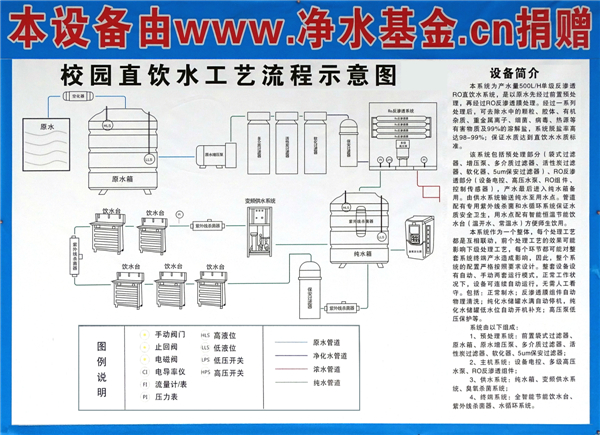 基金捐贈計劃總協調孟國偉在活動中,介紹「淨水」設備的運作過程。他指由於過度使用農藥化肥、生活垃圾及工業廢水的肆意排放等,致使水源受到重金屬、有害礦物質及有機物的嚴重污染。由此水質污染導致的消化疾病、傳染病、各種皮膚病、糖尿病、癌症、結石病、心血管病等多達50種,所以必須把學校的井水水質改善。「淨水」設備先用臭氧對井水消毒,再用石英砂過濾大顆粒漂浮物,繼用PP棉進一步過濾泥沙、鐵銹等顆粒雜質及活性碳吸附水中的異色臭味有機物。接?用最先進的反滲透膜濾芯來去除水中的化合物及重金屬,最後用紫外線殺菌。這樣水質才符合國家飲用水標準,讓師生們飲用。