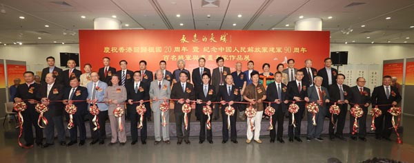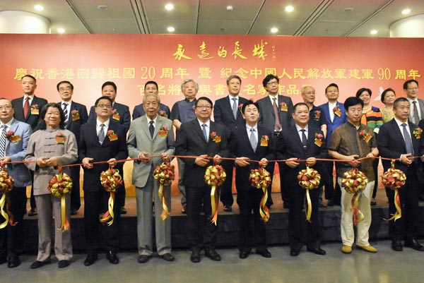 【香港商報網訊】記者曾美玲報道:由香港大公文匯傳媒集團與北京紅星閣將星書畫院共同舉辦的「永遠的長城」慶祝香港回歸祖國20周年暨紀念中國人民解放軍建軍90周年的百名將軍與書畫名家作品展,昨日在香港中央圖書館地下展覽館開幕。展覽共展出279幅書畫作品,來自120位將軍(包括18位上將、21位中將、81位少將)及20餘位內地知名書畫家。展期至9月4日。