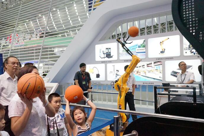 格力投籃機器人與小朋友現場比賽,百發百中。
