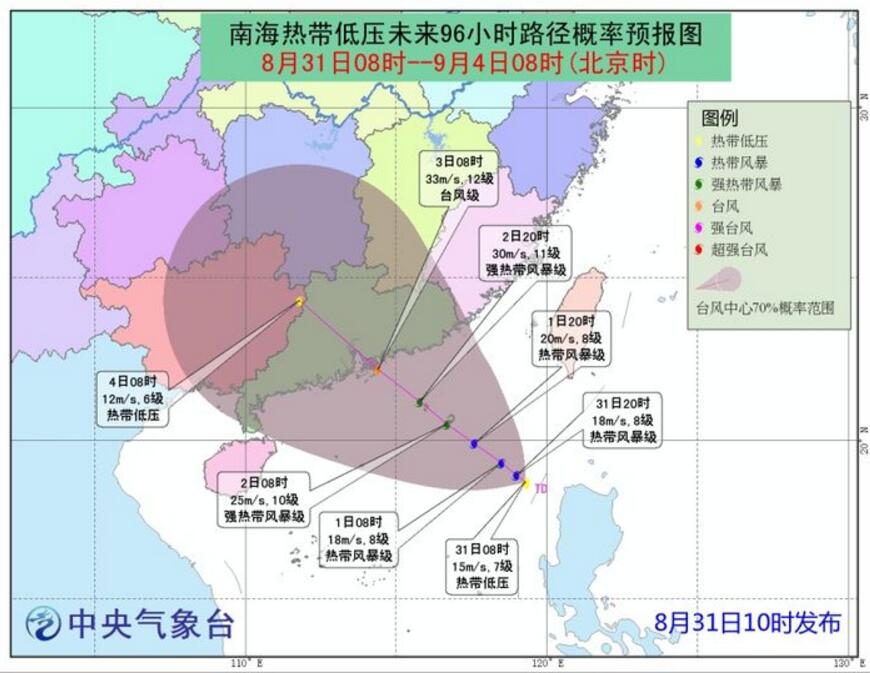 氣象台指出,該熱帶低壓中心正向廣東中部沿海靠近;隨後熱帶低壓的移動速度會逐漸加快,強度進一步加強,預計將於本周日(3日)前後在廣東中部沿海一帶登陸,預計登陸時強度為強熱帶風暴級或颱風級。