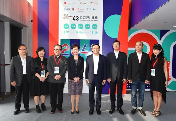 林鄭月娥(左四)、王偉中(右四)在前海深港創新中心出席「20……43香港設計事情」(深圳站)展覽開幕式。