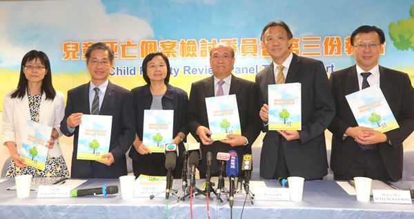 兒童死亡個案檢討委員主席許宗盛(右三)聯同小組召集人劉家輝醫生(右一)、楊家正博士(右二)等簡介報告重點。社會福利署署理助理署長(家庭及兒童福利)馬秀貞(左一)亦有出席簡報會。