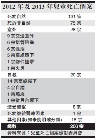 是次第三份報告,分析了由2012年至2013年,共有206宗18歲以下兒童死亡個案,全部已呈報死因裁判庭,數字自2010年后一直下跌。委員會主席許宗盛指出,這些個案中,75宗死於非自然因素,包括28宗死於意外、20宗自殺,8宗遇襲致死等。在20宗自殺個案中,14名兒童╱青少年從高處躍下喪命,當中最年幼的僅11歲。分析顯示學業問題、憂慮未來,以及與家人和男女朋友的關系為兒童╱青少年自殺的主要原因。