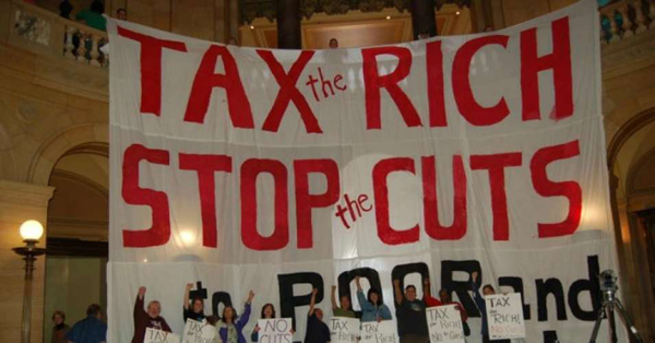 在會場內,有示威者高舉「向富人徵稅!停止減稅!」的標語。網絡圖片