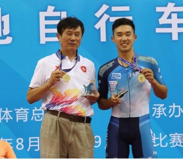 港隊單車代表梁峻榮(右)在男子個人全能賽取得金牌,圖為他與教練沈金康合影。