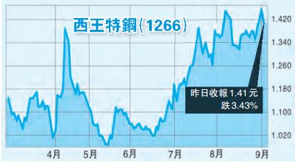 從一間中型鋼鐵股可以看到中國經濟的改善。西王特鋼(1266)年產500萬噸鋼鐵,是一間中型煉鋼廠,位於山東省濟南以南約50公里鄒田鎮,是山東重工業集中地。西王特鋼2017上半年營業額上升67.%至55.9億元,毛利升58.6%至7.5億元,純利升90.8%至3.1億元。