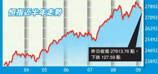【香港商報网訊】記者吳天淇報道:港股昨承接美股跌勢,恒指低開69點后,在控(005)以及中資金融股領跌之下,一度插319點低見27421點,慶幸騰訊(700)由跌轉升,紓緩大盤跌勢。恒指收市報27613點,跌127點或0.46%,20天線失而復得。國企指數收報11128點,跌62點或0.56%,主板全日成交896億元。
