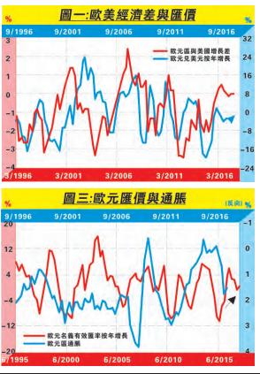 圖一可見,歐元區與美國經濟增長差與歐元兌美元按年增長走勢整體相若,前者領先約兩個季度,因此可作匯價短線走勢參考。在這前提下推測歐元兌美元匯價按年增長將見上升(藍尖嘴),可見其匯價有機會再創近三年新高,突破1.20重要關口。