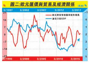 至於通脹,匯價升勢過強,將難免使入口價格回落,間接拉低整體消費物價指數。因此圖三可見,歐元名義有效匯率按年增長走勢與歐元區整體通脹(除了在2009年金融海嘯及歐債危機時關系不太明顯下)兩者整體走勢呈反比關系。匯價按年增長走勢反映在五個季度后的通脹水平,由此可見歐元區通脹在未來兩年呈下行壓力,在這前提下未見有加速收緊貨幣政策步伐的需要。