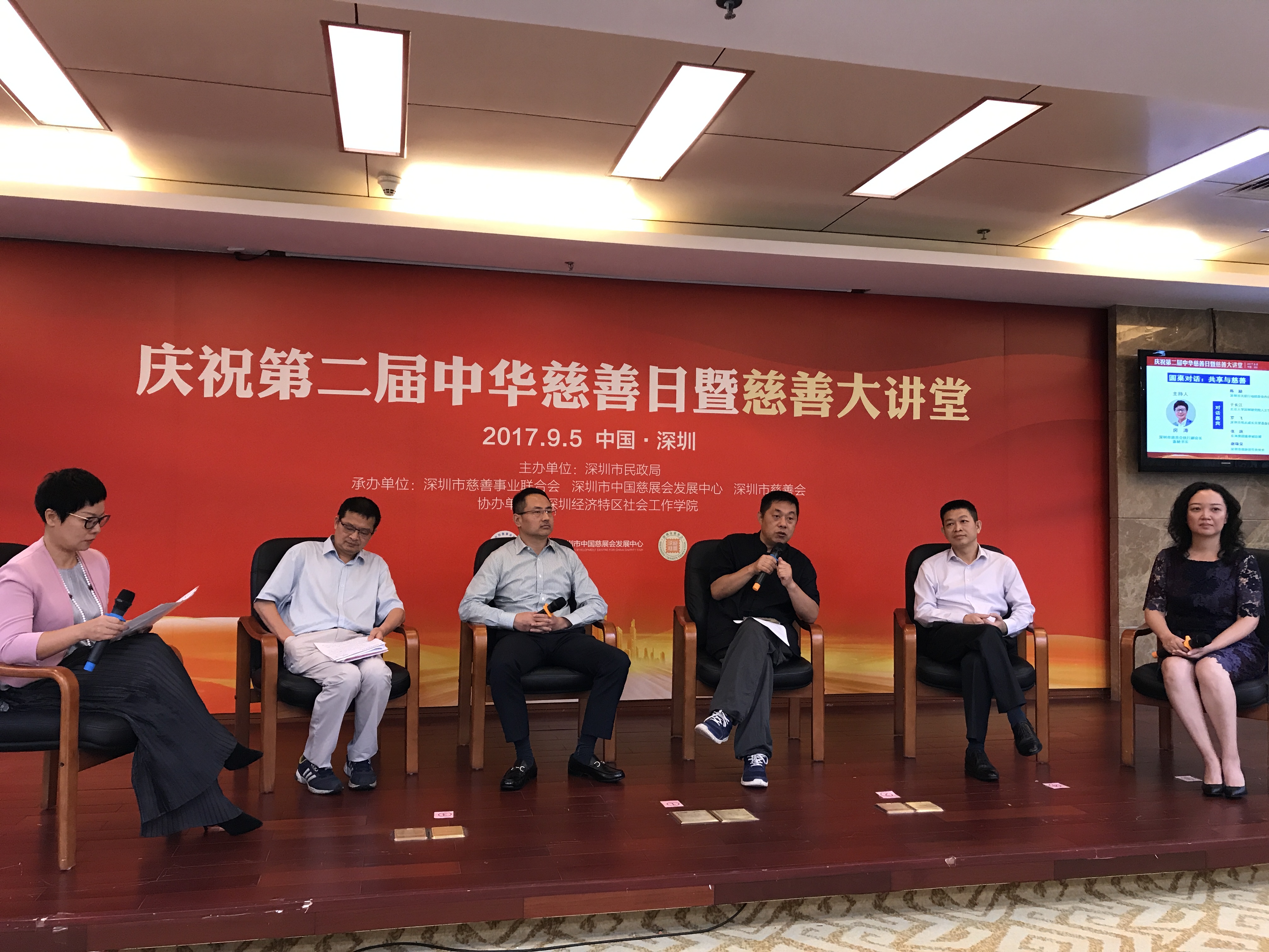 最後,活動就“共享與慈善”的熱點話題發起圓桌會議,深圳市慈善會執行副會長兼秘書長房濤擔任本次圓桌對話的主持人、,深圳市關愛行動組委會辦公室專職副主任陳勵、深圳市政協宣傳處處長謝頌泉、北京大學深圳研究生院人文學院副院長於長江、深圳市松禾成長關愛基金會執行理事長羅飛以及東海集團董事副總裁張祺作為談話嘉賓,共同就“共享跨界與慈善公益”的話題展開自由討論。