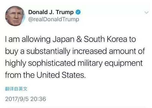 特朗普9月5日还在推特上写着:“我同意日本和韩国从美国购买大量精良装备的军事武器。”而对“美国动武”一说,只字不提。