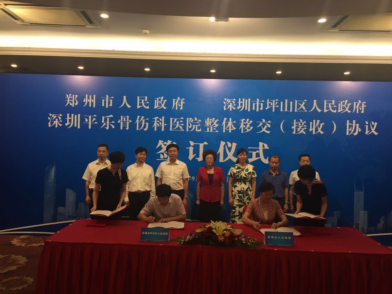 【香港商報網訊】記者焦家志 通訊員高坦,藺福輝,劉畫敏報道: 9月6日下午,鄭州市人民政府與深圳市坪山區人民政府在五洲賓館舉行了“深圳平樂骨傷科醫院整體移交(接收)協議簽訂儀式”。深圳市副市長吳以環,鄭州市副市長劉東,深圳市衛計委主任羅樂宣、副主任常巨平,深圳市坪山區區委書記呂玉印、區長陶永欣,鄭州市衛計委主任付桂榮等領導出席簽訂儀式。