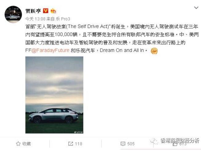 贾老板这段时间也在充分发挥演说家优势,辗转香港、美国为自己的超级烧钱的乐视汽车拉融资。就在昨天,贾跃亭控股的乐视汽车传来消息,指乐视汽车中国已经明确下一阶段五大核心业务,汽车量产进入倒计时。贾布斯自从到了美国,消息甚少,人们一般都从他的微博上了解他的近况,最近一条微博写道: