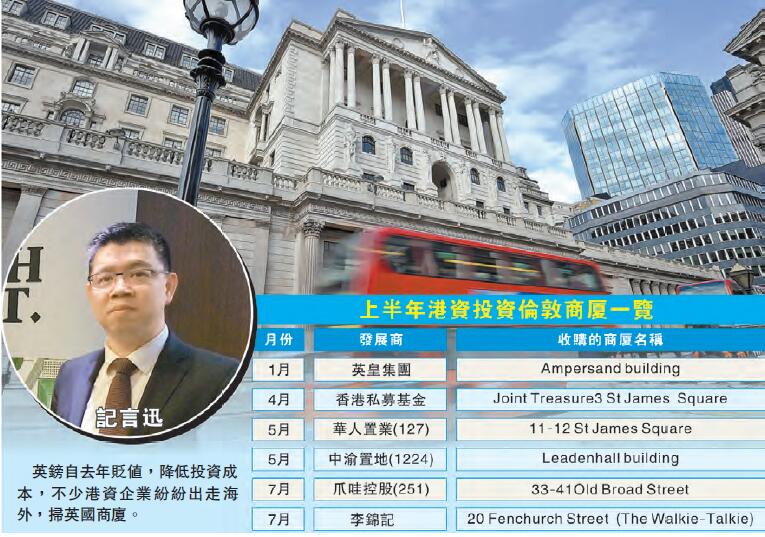 除了遠東發展外,今年還有不少港企投資英國物業,當中李錦記7月以15.45億美元(約120.79億元)購入位於倫敦市中心、俗稱The Walkie-Talkie的商廈20 Fenchurch Street回響最大,皆因此成交打破了年初中渝置地(1224)以13.59億美元(約106.25億元)購置Leadenhall大廈的成交紀錄。其他有投資倫敦物業的公司,還有英皇集團(163)、華人置業(127)、爪哇控股(251)等。