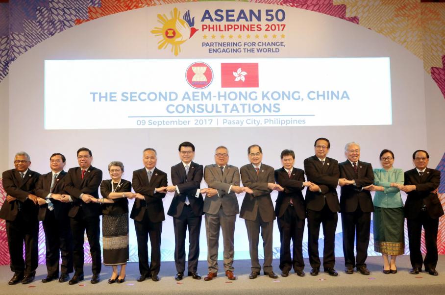 香港與東盟的《自貿協定》談判於2014年7月展開,并於2017年7月結束。香港與東盟的貨物貿易總額在2016年達到8330億港元,而雙方的服務貿易總額在2015年則達1210億港元。投資方面,截至2015年底,東盟為香港的第六大向外直接投資目的地,有關投資存量為2180億港元;東盟亦為香港的第六大外來直接投資來源地,有關投資存量為5550億港元。