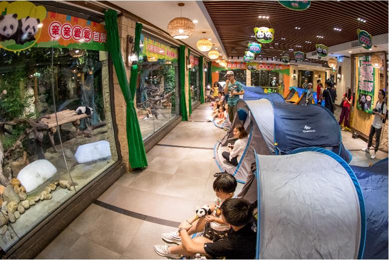 熊猫双胞胎陪伴游客夜宿。