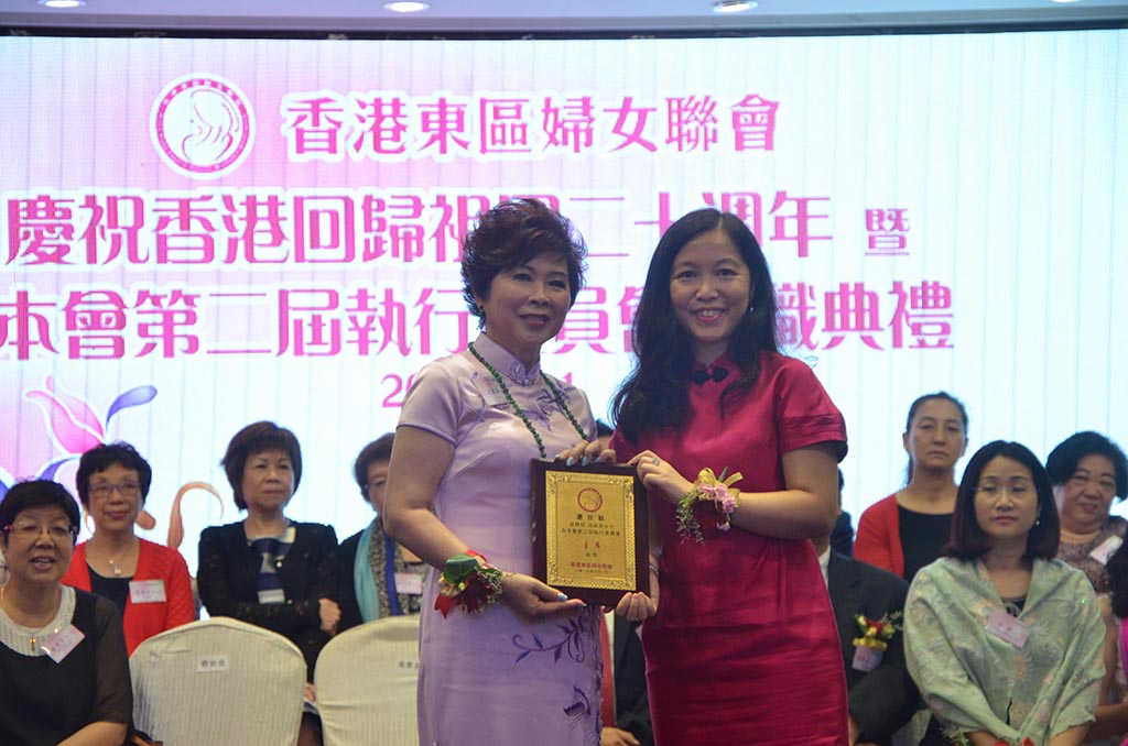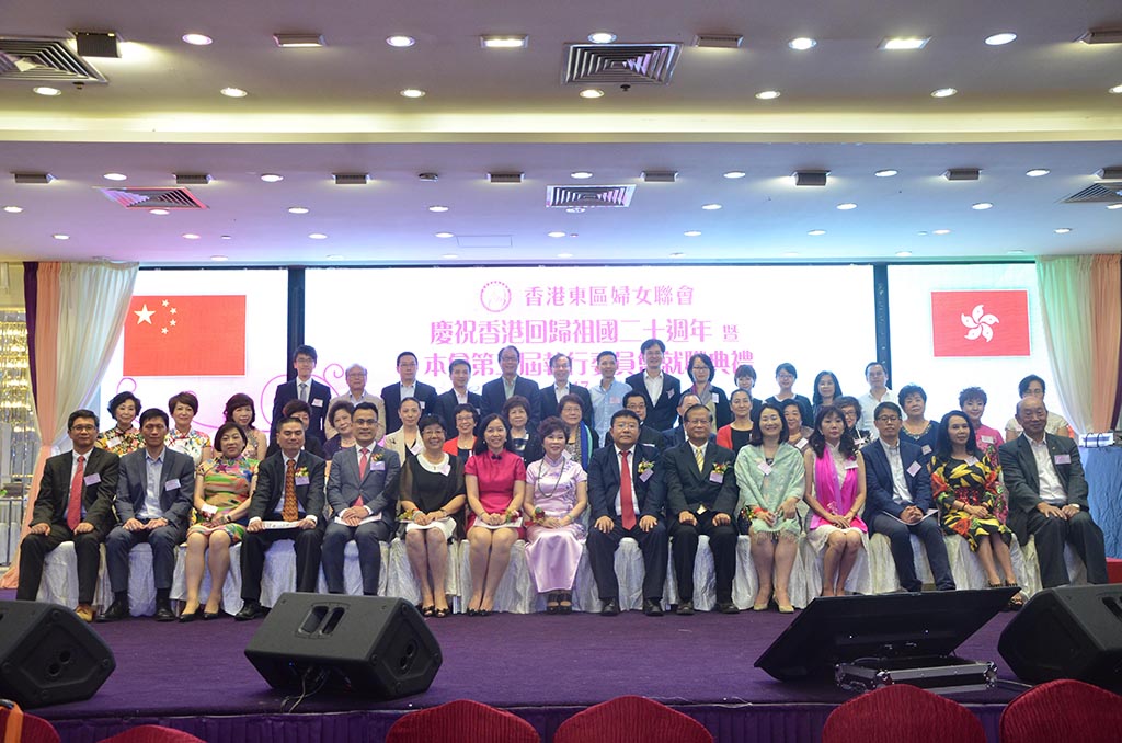 【香港商報網訊】記者文曉琳報道:慶祝香港回歸祖國二十周年暨香港東區婦女聯會第二屆執行委員會就職典禮日前假北角富臨皇宮隆重舉行,中聯辦港島工作部副部長范克勝、東區民政事務專員鄧如欣、東區區議會主席黃建彬、港區全國人大代表蔡素玉、立法會議員郭偉強、香港東區各界協會會長朱浴龍、東區助理警民關系主任郭永全、香港及灣仔區策劃及純籌小組社會工作主任鄭自明等嘉賓蒞臨主禮。主席馮翠屏、創會會長陳杏及新一屆會長林靜詩聯同主禮嘉賓鄉親、友好、社會賢達逾500人共同見證,場面熱鬧。