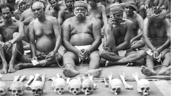 7月,泰米尔纳德邦农民摆放骷髅头和大腿骨抗议。
