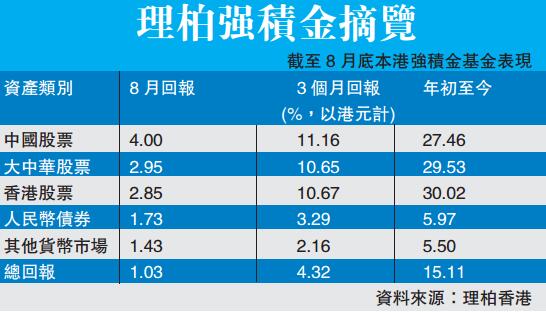另外,第2季本港強積金基金平均回報率則為4.32%,當中,中國股票基金、大中華股票基金、香港股票基金的回報率均超過10%,分別錄得11.16%、10.65%和10.67%回報。累計今年首8個月,強積金基金投資回報率達15.11%。當中表現最好的是中國、大中華及香港股票基金,回報率介乎27%至30%;而表現最差的是港元及美元貨幣基金,回報率僅1%。至於日本以外的亞太股票基金及全球債券基金,回報率約1%。