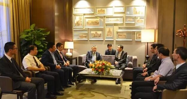 江门市副市长蔡德威(中座右)与吉尔吉斯共和国驻广州总领事(中座左)交流两地合作意向.