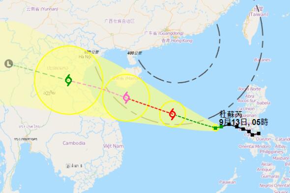天文台發放「杜蘇芮」最新預測路徑,根據今晨早上5時資料,「杜蘇芮」路徑進一步西調,不會登陸海南島。在天氣預測方面,周五大致多雲,有幾陣狂風驟雨,周日才會部分時間有陽光。