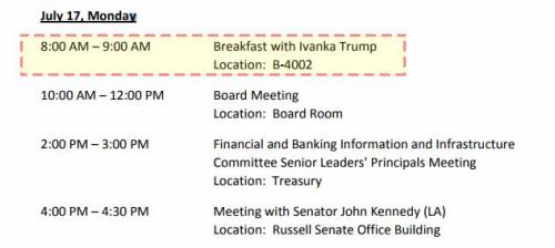 聯儲局主席耶倫的公開日曆顯示,她在7月17日與總統特朗普的女兒伊萬卡共晉早餐,談話內容沒有公開。不過,在兩人會面後的一星期,特朗普向《華爾街日報》表示,耶倫絕對是角逐聯儲局主席的人選之一,絕對有可能連任。