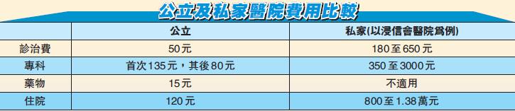 私家醫院就很大程度上緩解了這個狀況。但私家醫院則出名收費貴,如不幸罹患重大的疾病,動輒過十萬百萬元的醫療費用,對不少市民來說,簡直是天價。到私家醫院看病,每個環節都有不同收費,單是診金每次就要約180元到650元不等,專科醫生的診金更是遠超這個數字。另外,病人還須額外支付化驗、X光檢驗等費用。例如港安醫院,單是胃鏡檢查,就要9730元。
