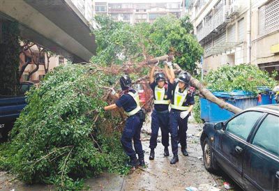 澳門司警於風災后清理倒塌的樹木。