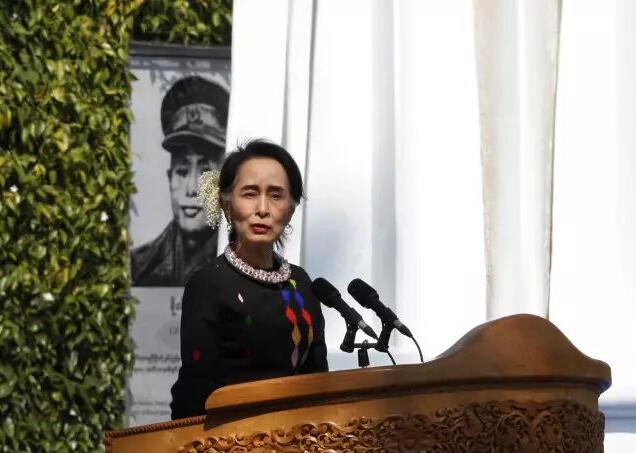 2月12日,在缅甸掸邦彬龙镇,缅甸国务资政昂山素季在活动上致辞,呼吁缅甸所有民族武装加入和平进程。新华社/美联社