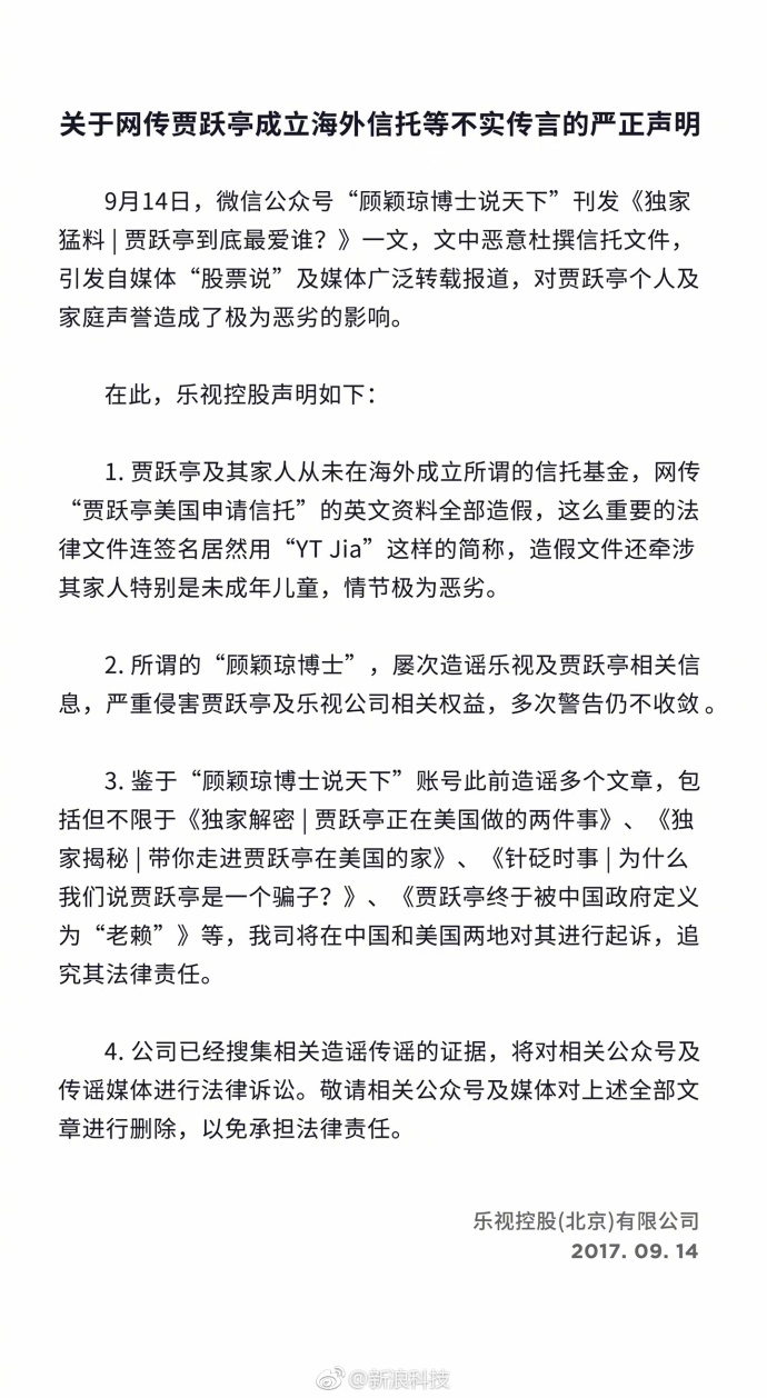 對此樂視控股發布聲明稱,文中惡意杜撰信托文件,對賈躍亭家人及個人聲譽造成了極為惡劣的影響,公司已搜集相關造謠傳謠證據,將對相關公眾號進行法律訴訟。