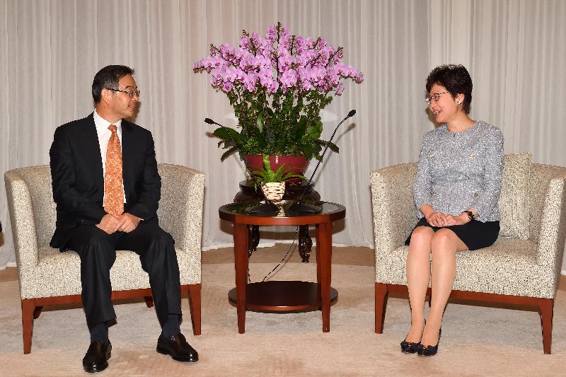 林鄭月娥歡迎周強來港參加「第四屆海峽兩岸暨香港澳門司法高層論壇」,亦感謝最高人民法院一直以來對兩地司法協助工作,以及香港作為亞太區國際法律及爭議解決服務中心的支持。