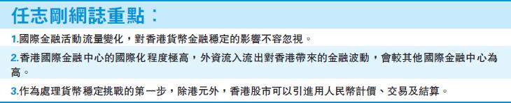 任志剛指出,香港是個細小的經濟體,但在香港以港幣作為交易單位所進行的國際金融活動的成交量,卻相對地遠遠大於本地經濟的規模。因此,國際金融活動的流量變化,對香港經濟的影響,尤其是在貨幣金融穩定方面,是強大和不容忽視的。隨着內地投資者及集資者在資本項目進一步放寬下多走出去,這個差距將會越來越大,隨之而來對貨幣金融穩定的風險亦會增加。