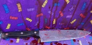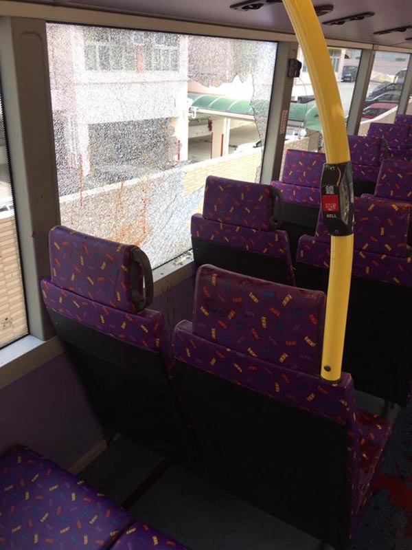 巴士上層車窗被敲破。小圖為遺留在座位上的凶刀。