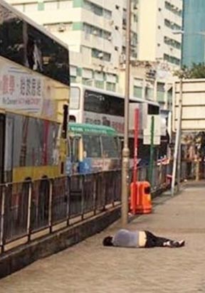 青年行凶后由巴士上層破窗跳落行人路后不能動彈。(網上圖片)