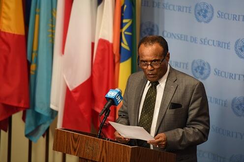 9月15日,在位于纽约的联合国总部,联合国安理会本月轮值主席国埃塞俄比亚常驻联合国代表阿莱穆举行媒体吹风会。联合国安理会15日发表媒体声明,严厉谴责朝鲜再次试射弹道导弹,指出这是对国际社会的一次“严重挑衅行为”。 新华社记者李睿摄