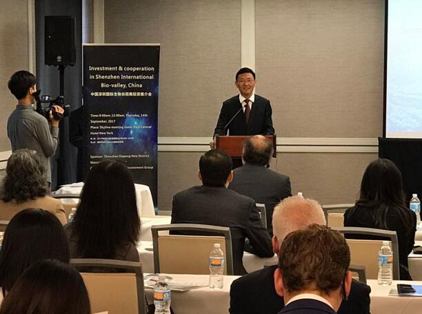 【香港商报网讯】记者朱开芝、通讯员廖其年、廖政华报道:作为生物岛建设的主场深圳市大鹏新区又有了新突破,2017年9月14日(纽约时间)上午,2017中国深圳国际生物谷投资推介会在美国纽约公园中央酒店举行,会议由深圳市大鹏新区党工委副书记、管委会主任李勇先生主持,中国驻纽约总领馆经济商务领事周善青、新华社驻联合国分社社长马建国、美国中国总商会秘书长牛灿及美国的科学家、企业家及投资届的朋友100余位参加此次会议,共同探讨生物与生命健康产业投资发展的新机遇。