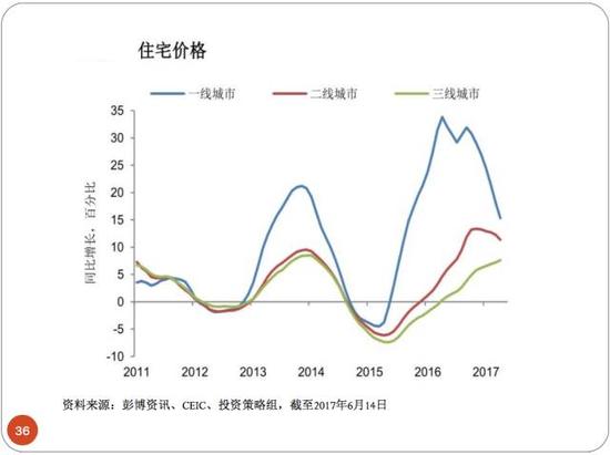 但這裏可以看出來三線城市反而是持續上升的,為什么?在我們的計算中我們的房地產銷售實際上按純商品房計算是負增長的,但是為什么前頭是正增長呢?是因為我們有一個新的政策叫棚改裏頭的貨幣化拆遷。