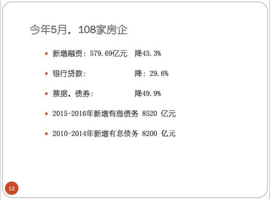 我們再看看今年一到五月份,我們的108家房地產企業,從新資融資下降了百分之五,銀行貸款下降了29%,票據債券下降了49%,所以今年上半年大幅度下滑,六月份也沒有起色,七月份我們看到的是境外融資超過了一百億美元,房地產企業從國內拿不到錢就都跑到國外拿錢去了。