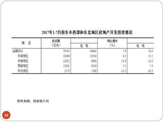 我們看看東北地區是負的百分之十點幾的增長,那么換句話說如果扣去了東三省是不是我們其他地區的還是正增長呢?因為東三省太差了,叫做投資不過山海關。我們再看看漲幅,商品房銷售面積和商品房銷售價格的漲幅之間差告訴你的就是價格上升。
