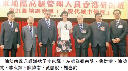 【香港商報网訊】記者曾美玲報道:由香港潮屬社團總會主辦、嶺南大學承辦的「第21期粵東地區高級管理人員香港研討班」日前假香港潮州會館大禮堂舉行結業禮。45位來自汕頭、汕尾、潮州、揭陽及汕頭大學、韓山師範學院的學員在港完成為期一周、主題為「現代城市管理」的學習,形式包括授課及實地考察,希望藉此學習,借鑒香港先進的城市管理經驗。