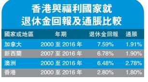 另一方面,行政程序低效導致收費相對高昂,影響了香港強積金的投資回報。報告指,由2000年至2016年,香港強積金回報率約為2.8%,雖然跑贏平均通脹的1.8%,但回報率則大幅跑輸加拿大(7.59%)、澳洲(6.48%)及新西蘭(6.78%)年。至於同期恒生指數的平均回報率,約為5%。